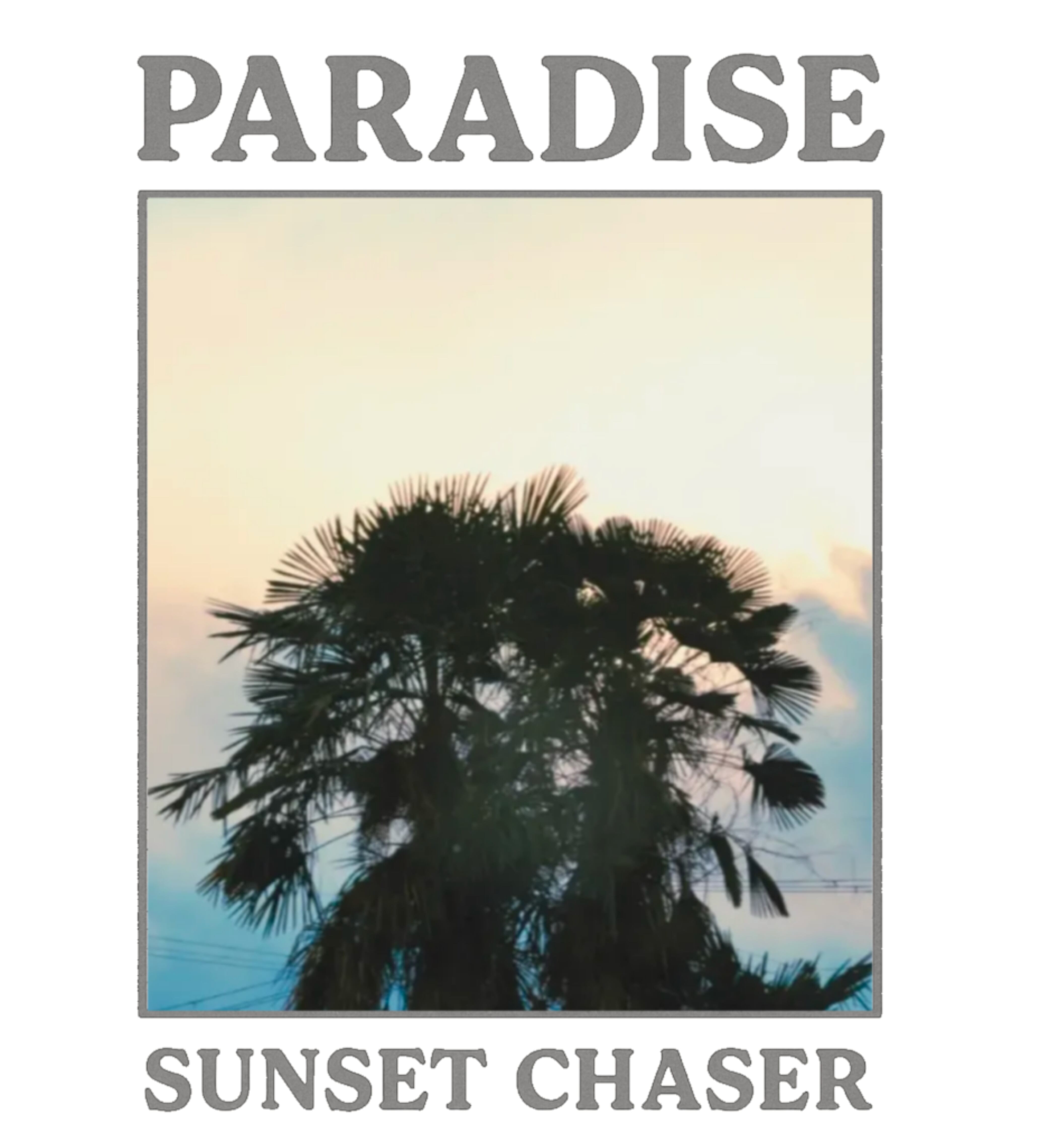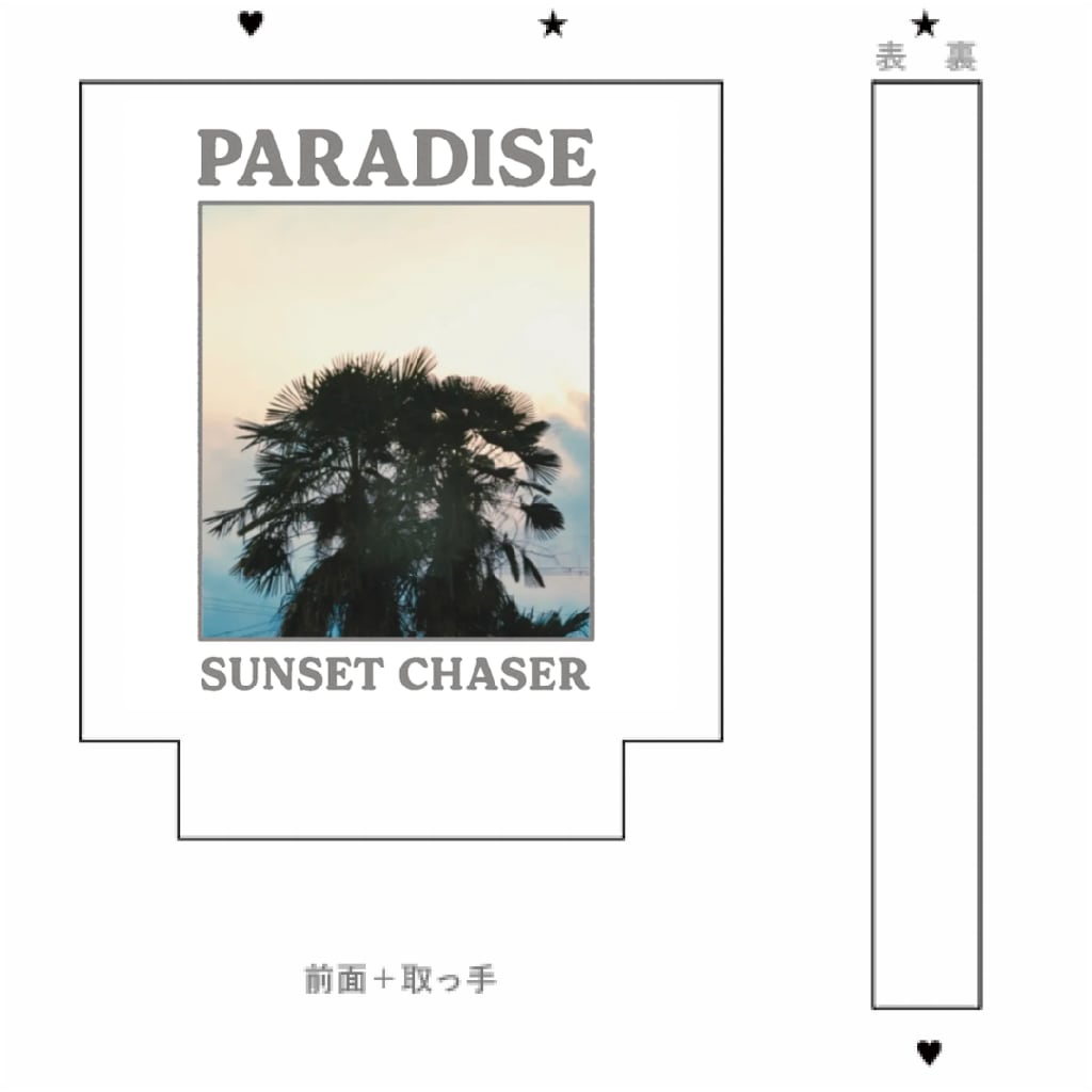 「PARADISE」「SUNSET CHASER」の文字が刻まれたこのデザインは、旅する気分と空を追いかける感覚をまとうアイテム。